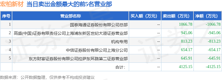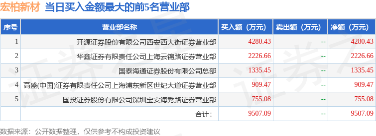 证券之星消息,沪深交易所2026年1月20日公布的交易公开信息显示,宏柏新材(605366)因有价格涨跌幅限制的日收盘价格涨幅偏离值达到7%的前五只证券登上龙虎榜。此次是近5个交易日内第1次上榜。