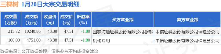 证券之星消息,1月20日三棵树发生大宗交易,交易数据如下: