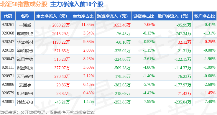 资金流向方面,北证50(899050)指数成份股当日主力资金净流出合计5.53亿元,游资资金净流出合计3.05亿元,散户资金净流出合计5004.21万元。成份股资金流向详情见下表: