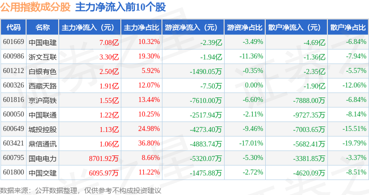 资金流向方面,公用指数(000007)成份股当日主力资金净流入合计5.28亿元,游资资金净流出合计6.96亿元,散户资金净流入合计1.68亿元。成份股资金流向详情见下表: