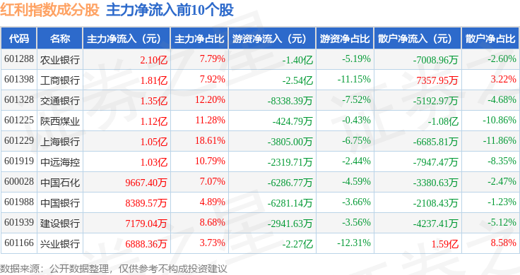 资金流向方面,红利指数(000015)成份股当日主力资金净流入合计14.18亿元,游资资金净流出合计10.54亿元,散户资金净流出合计3.64亿元。成份股资金流向详情见下表:
