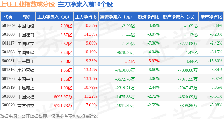 资金流向方面,上证工业(000034)指数成份股当日主力资金净流出合计20.29亿元,游资资金净流入合计11.25亿元,散户资金净流入合计9.04亿元。成份股资金流向详情见下表: