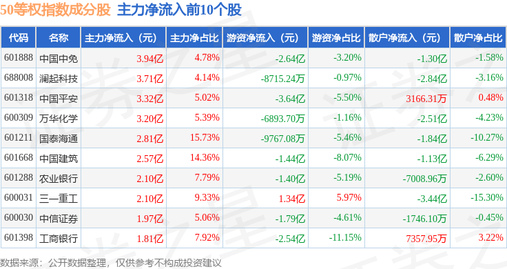 资金流向方面,50等权(000050)指数成份股当日主力资金净流出合计17.06亿元,游资资金净流出合计9.66亿元,散户资金净流入合计26.72亿元。成份股资金流向详情见下表:
