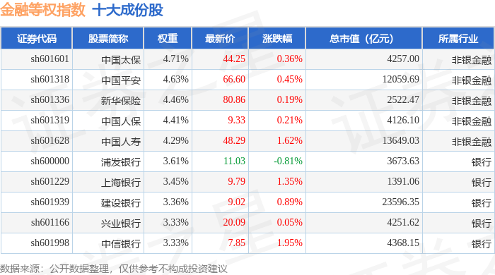 证券之星消息,1月20日,金融等权(000076)指数报收于5643.36点,涨0.84%,成交451.63亿元,换手率0.27%。当日该指数成份股中,上涨的有29家,中信银行以1.95%的涨幅领涨,下跌的有1家,浦发银行以0.81%的跌幅领跌。