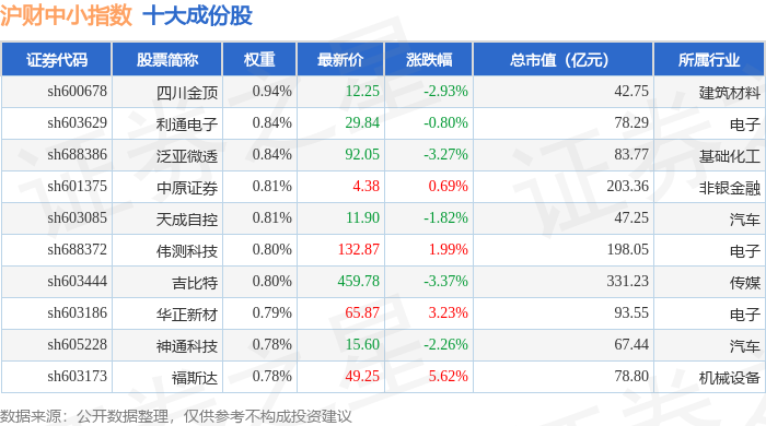 证券之星消息,1月20日,沪财中小(000091)指数报收于15813.15点,跌0.27%,成交672.02亿元,换手率3.22%。当日该指数成份股中,上涨的有90家,沧州大化以10.0%的涨幅领涨,下跌的有104家,浩瀚深度以10.55%的跌幅领跌。