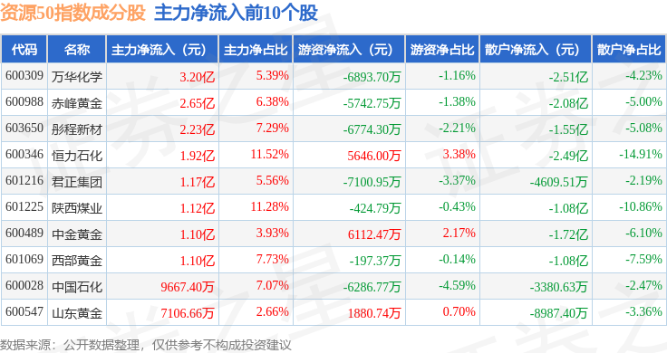 资金流向方面,资源50(000092)指数成份股当日主力资金净流出合计20.36亿元,游资资金净流入合计3.95亿元,散户资金净流入合计16.42亿元。成份股资金流向详情见下表:
