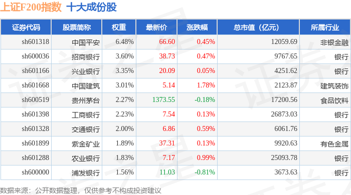 证券之星消息,1月20日,上证F200(000098)指数报收于5603.07点,涨0.98%,成交3222.24亿元,换手率0.83%。当日该指数成份股中,上涨的有160家,白银有色以10.03%的涨幅领涨,下跌的有36家,天合光能以9.29%的跌幅领跌。