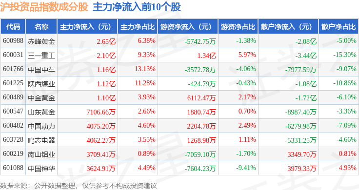 资金流向方面,沪投资品(000102)指数成份股当日主力资金净流出合计73.11亿元,游资资金净流入合计20.58亿元,散户资金净流入合计52.54亿元。成份股资金流向详情见下表: