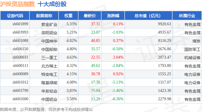 沪投资品(000102)指数十大成份股详情如下: