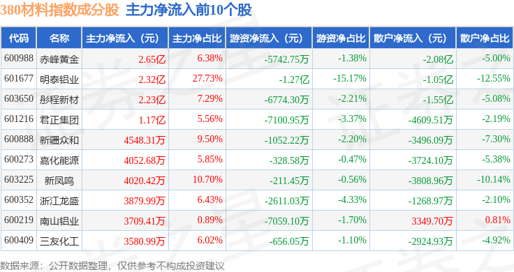 资金流向方面,380材料(000105)指数成份股当日主力资金净流出合计8.04亿元,游资资金净流入合计1.01亿元,散户资金净流入合计7.04亿元。成份股资金流向详情见下表:
