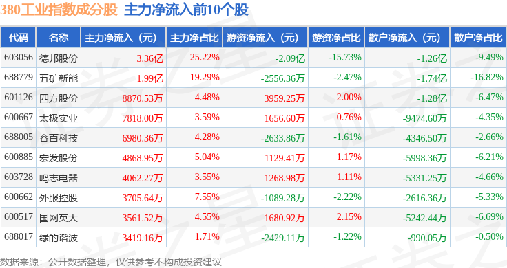 资金流向方面,380工业(000106)指数成份股当日主力资金净流出合计56.46亿元,游资资金净流入合计11.23亿元,散户资金净流入合计45.22亿元。成份股资金流向详情见下表:
