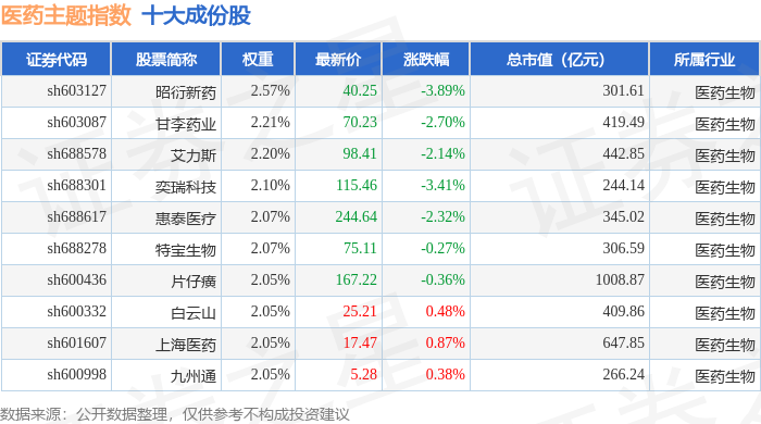 医药主题(000121)指数十大成份股详情如下: