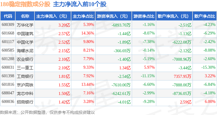 资金流向方面,180稳定(000125)指数成份股当日主力资金净流入合计33.96亿元,游资资金净流出合计19.15亿元,散户资金净流出合计14.81亿元。成份股资金流向详情见下表: