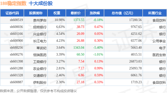 证券之星消息,1月20日,180稳定(000125)指数报收于11708.86点,涨0.57%,成交1197.05亿元,换手率0.4%。当日该指数成份股中,上涨的有80家,中国化学以10.01%的涨幅领涨,下跌的有10家,寒武纪以5.4%的跌幅领跌。