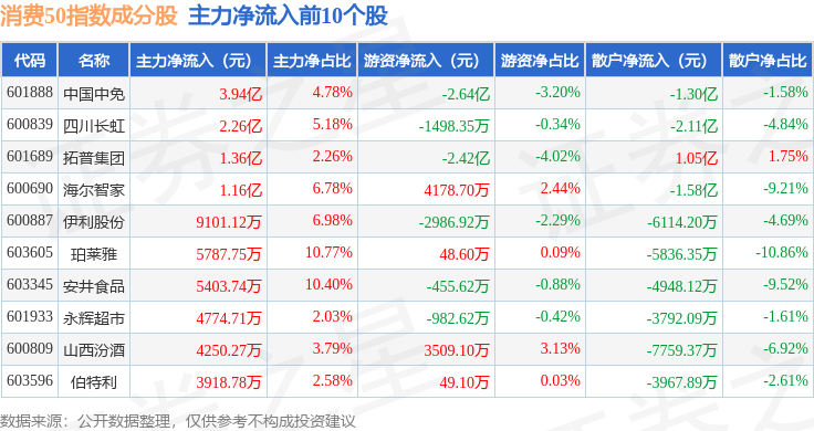 资金流向方面,消费50(000126)指数成份股当日主力资金净流出合计3.52亿元,游资资金净流入合计5462.27万元,散户资金净流入合计2.98亿元。成份股资金流向详情见下表:
