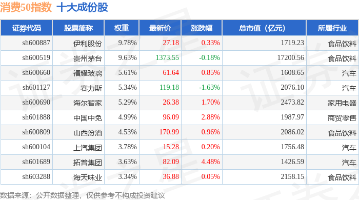 消费50(000126)指数十大成份股详情如下: