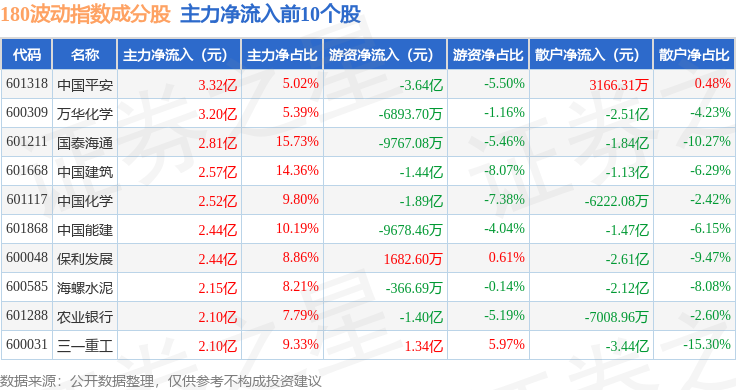 资金流向方面,180波动(000129)指数成份股当日主力资金净流入合计51.07亿元,游资资金净流出合计21.03亿元,散户资金净流出合计30.04亿元。成份股资金流向详情见下表: