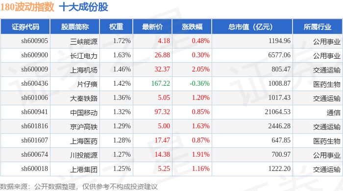证券之星消息,1月20日,180波动(000129)指数报收于15251.88点,涨1.29%,成交1202.09亿元,换手率0.45%。当日该指数成份股中,上涨的有94家,中国化学以10.01%的涨幅领涨,下跌的有6家,长城汽车以0.91%的跌幅领跌。