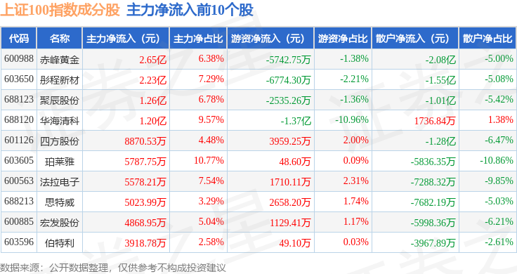资金流向方面,上证100(000132)指数成份股当日主力资金净流出合计19.88亿元,游资资金净流入合计12.22亿元,散户资金净流入合计7.66亿元。成份股资金流向详情见下表: