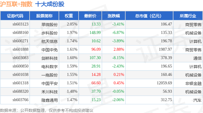 证券之星消息,1月20日,沪互联+(000162)指数报收于3828.86点,跌1.01%,成交818.87亿元,换手率1.6%。当日该指数成份股中,上涨的有27家,中国中免以2.88%的涨幅领涨,下跌的有43家,上海沪工以8.71%的跌幅领跌。