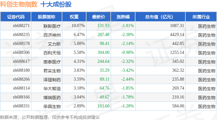 证券之星消息,1月20日,科创生物(000683)指数报收于1129.48点,跌1.77%,成交122.92亿元,换手率1.48%。当日该指数成份股中,上涨的有8家,华恒生物以1.6%的涨幅领涨,下跌的有42家,迪哲医药以5.1%的跌幅领跌。