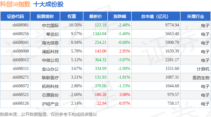 科创50(000688)指数十大成份股详情如下: