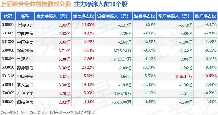 资金流向方面,上证综合全收益(000888)指数成份股当日主力资金净流出合计341.51亿元,游资资金净流入合计93.24亿元,散户资金净流入合计248.27亿元。成份股资金流向详情见下表: