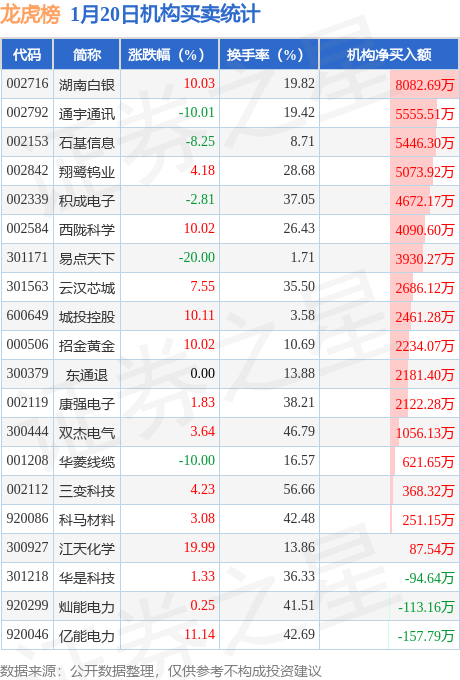 当日公布的交易所龙虎榜中有机构专用席位现身的个股共30家,其中湖南白银以净买入8082.69万元排名第一。详情见下表: