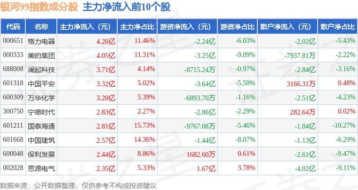 资金流向方面,银河99(000959)指数成份股当日主力资金净流出合计121.42亿元,游资资金净流入合计15.42亿元,散户资金净流入合计106.0亿元。成份股资金流向详情见下表: