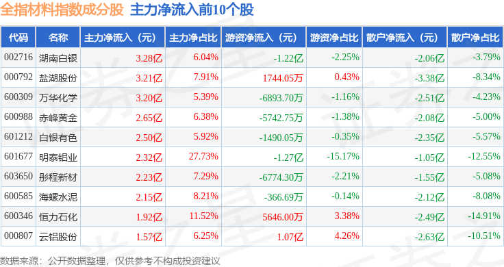 资金流向方面,全指材料(000987)指数成份股当日主力资金净流出合计46.74亿元,游资资金净流入合计15.0亿元,散户资金净流入合计31.73亿元。成份股资金流向详情见下表: