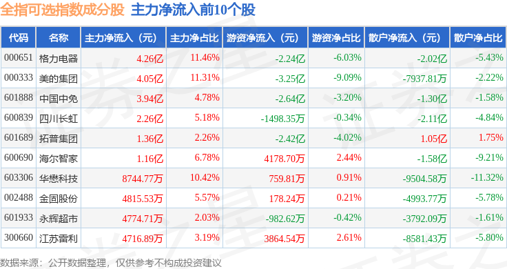 资金流向方面,全指可选(000989)指数成份股当日主力资金净流出合计40.08亿元,游资资金净流入合计12.04亿元,散户资金净流入合计28.04亿元。成份股资金流向详情见下表: