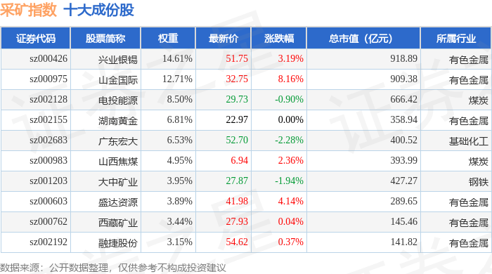 采矿指数(399232)十大成份股详情如下: