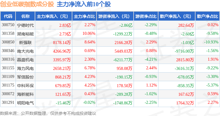 资金流向方面,创业低碳(399259)指数成份股当日主力资金净流出合计44.96亿元,游资资金净流入合计9.25亿元,散户资金净流入合计35.72亿元。成份股资金流向详情见下表: