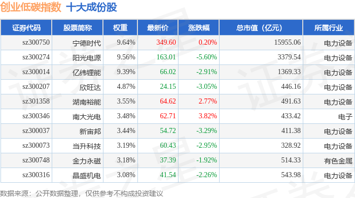 创业低碳(399259)指数十大成份股详情如下: