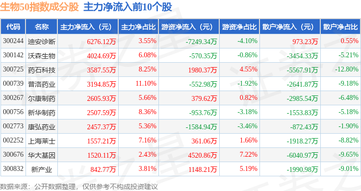 资金流向方面,生物50(399280)指数成份股当日主力资金净流出合计7.37亿元,游资资金净流入合计4.06亿元,散户资金净流入合计3.31亿元。成份股资金流向详情见下表:
