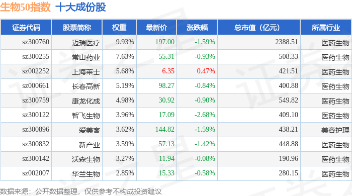 证券之星消息,1月20日,生物50(399280)指数报收于2129.08点,跌0.86%,成交173.64亿元,换手率2.63%。当日该指数成份股中,上涨的有12家,康华生物以1.58%的涨幅领涨,下跌的有37家,广生堂以4.54%的跌幅领跌。