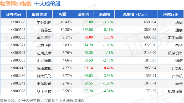 物联网50(399285)指数十大成份股详情如下: