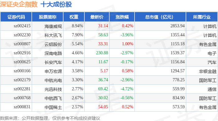 深证央企(399335)指数十大成份股详情如下: