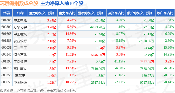 资金流向方面,环渤海(399357)指数成份股当日主力资金净流入合计7.32亿元,游资资金净流入合计11.11亿元,散户资金净流出合计18.43亿元。成份股资金流向详情见下表: