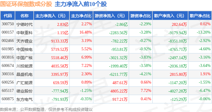资金流向方面,国证环保(399358)指数成份股当日主力资金净流出合计86.19亿元,游资资金净流入合计23.02亿元,散户资金净流入合计63.17亿元。成份股资金流向详情见下表: