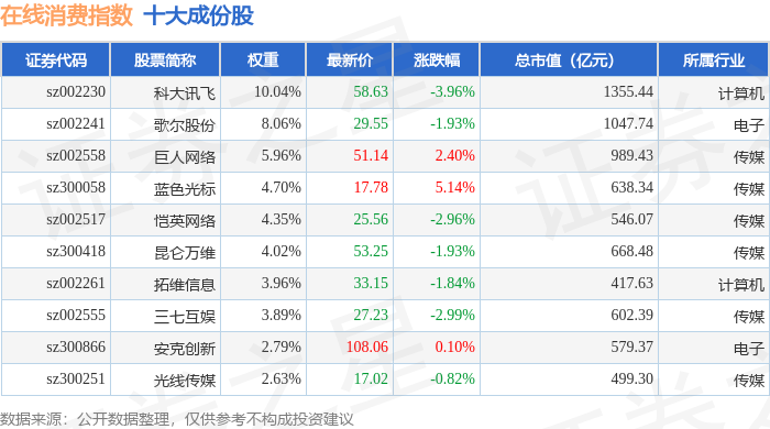 在线消费(399361)指数十大成份股详情如下:
