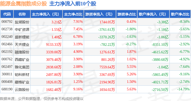 资金流向方面,能源金属(399366)指数成份股当日主力资金净流出合计35.22亿元,游资资金净流入合计10.66亿元,散户资金净流入合计24.39亿元。成份股资金流向详情见下表: