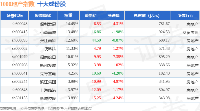 证券之星消息,1月20日,1000地产(399367)指数报收于2681.21点,涨2.04%,成交138.65亿元,换手率2.09%。当日该指数成份股中,上涨的有13家,中华企业以10.14%的涨幅领涨,下跌的有3家,先导基电以4.2%的跌幅领跌。