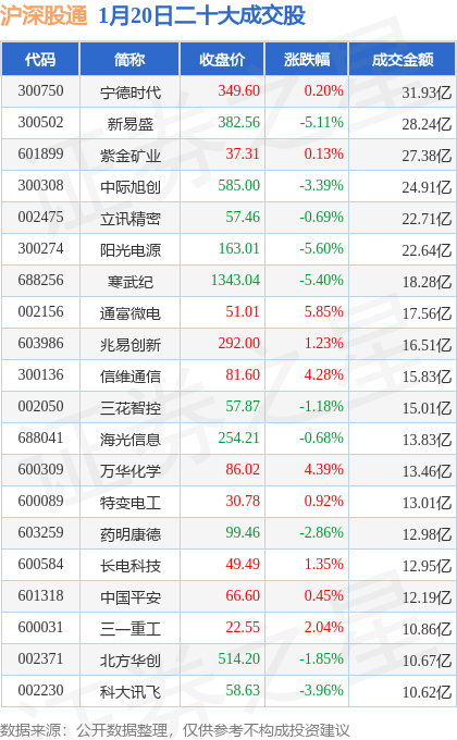 当日北向资金余额额度充足,江化微(603078)领涨,涨幅9.99%,交易所公布的沪深股通二十大成交股中成交额前三的为宁德时代、新易盛、紫金矿业,成交额分别为31.93亿元、28.24亿元、27.38亿元。详情可见下表: