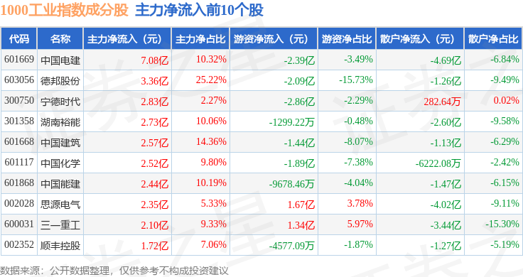 资金流向方面,1000工业(399383)指数成份股当日主力资金净流出合计171.46亿元,游资资金净流入合计44.15亿元,散户资金净流入合计126.54亿元。成份股资金流向详情见下表: