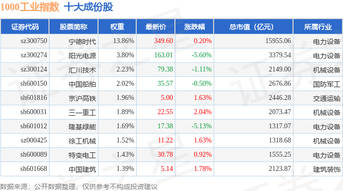 证券之星消息,1月20日,1000工业(399383)指数报收于3133.44点,跌0.81%,成交3503.73亿元,换手率2.05%。当日该指数成份股中,上涨的有103家,中国化学以10.01%的涨幅领涨,下跌的有118家,鹏辉能源以9.32%的跌幅领跌。