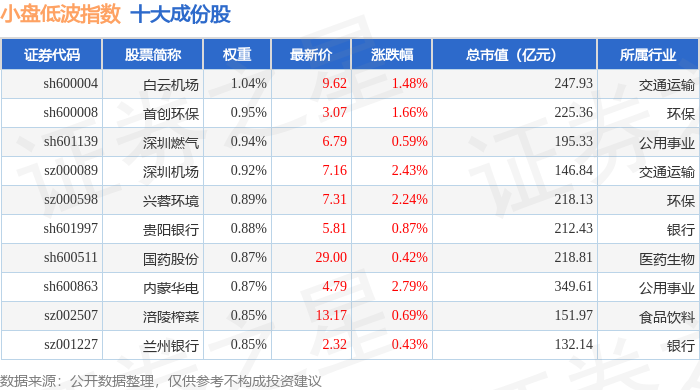 证券之星消息,1月20日,小盘低波(399408)指数报收于15977.68点,涨1.13%,成交559.55亿元,换手率1.59%。当日该指数成份股中,上涨的有119家,中华企业以10.14%的涨幅领涨,下跌的有27家,人民网以5.88%的跌幅领跌。