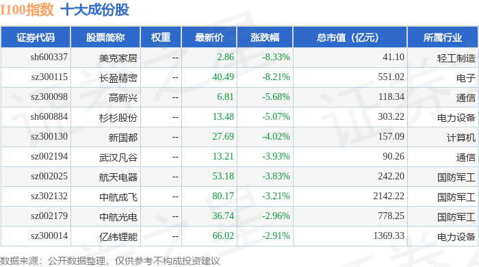证券之星消息,1月20日,I100(399415)指数报收于7789.98点,涨0.19%,成交1421.93亿元,换手率0.59%。当日该指数成份股中,上涨的有57家,新联电子以10.01%的涨幅领涨,下跌的有36家,美克家居以8.33%的跌幅领跌。