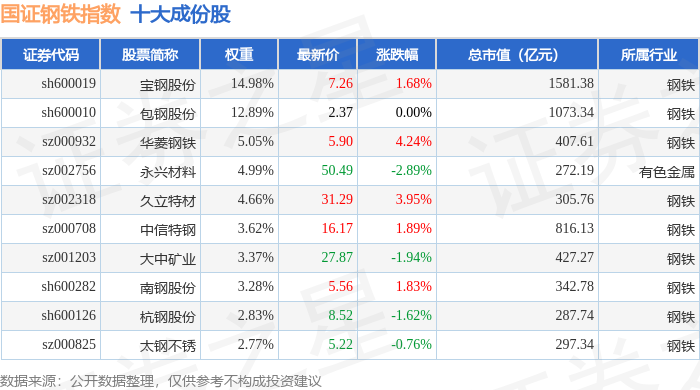 国证钢铁(399440)指数十大成份股详情如下: