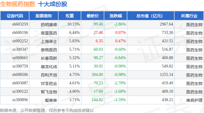 生物医药(399441)指数十大成份股详情如下: